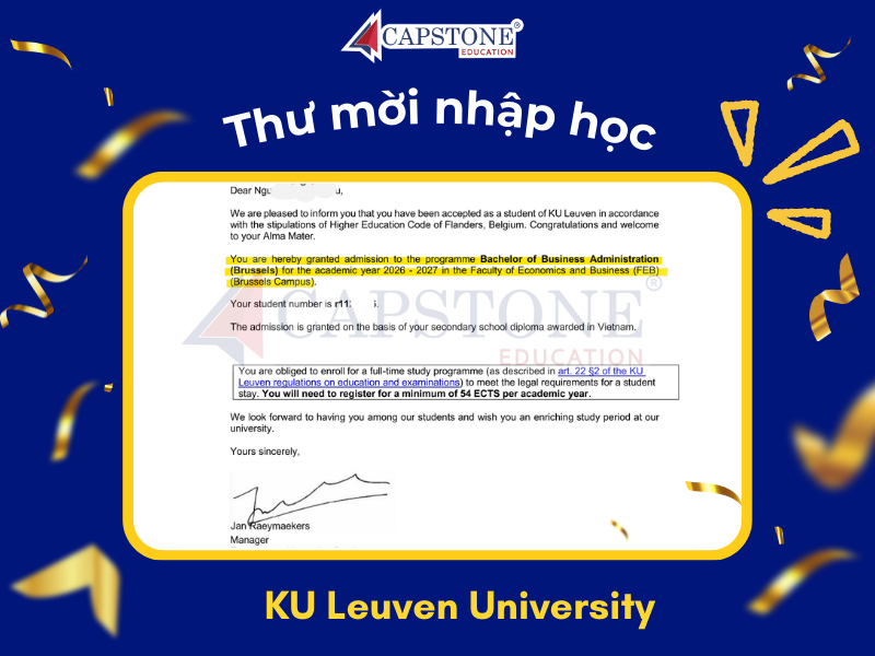 Nhờ bộ hồ sơ du học Bỉ được chuẩn bị chỉn chu, Thiên Triều đã xuất sắc nhận thư mời nhập học từ KU Leuven - một trong những trường đại học hàng đầu châu Âu. Hành trình của Triều là ví dụ rõ ràng cho cách Capstone đồng hành để giúp học sinh nổi bật và nâng cao cơ hội trúng tuyển. Khám phá bí quyết Capstone giúp em hiện thực hóa giấc mơ du học!