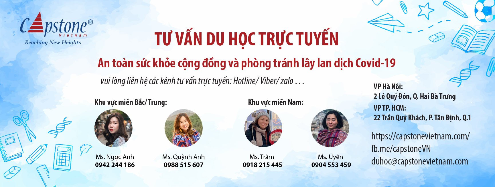 Thời gian này, để đảm bảo sức khoẻ cộng đồng, các thành viên của Capstone đều làm việc online tại nhà, văn phòng ở HN và HCM hiện tạm thời đóng cửa, vui lòng liên hệ theo sdt/zalo và email của các cố vấn giáo dục để Capstone Vietnam hỗ trợ nhanh chóng nhất.